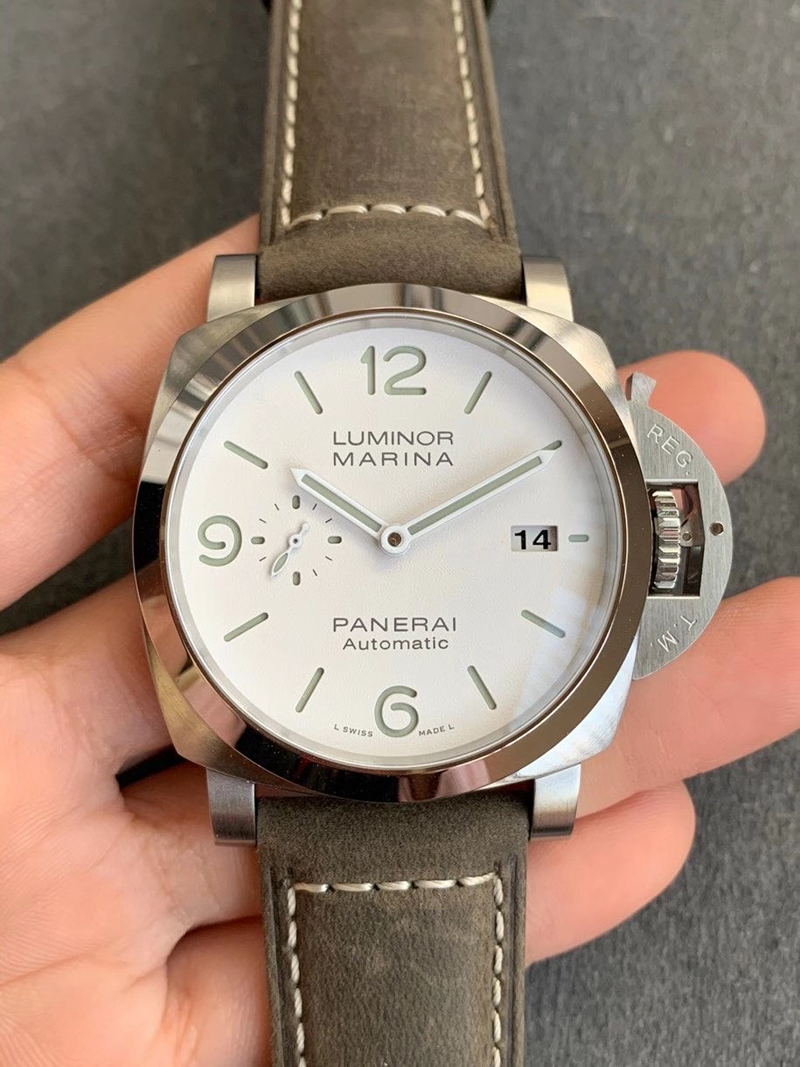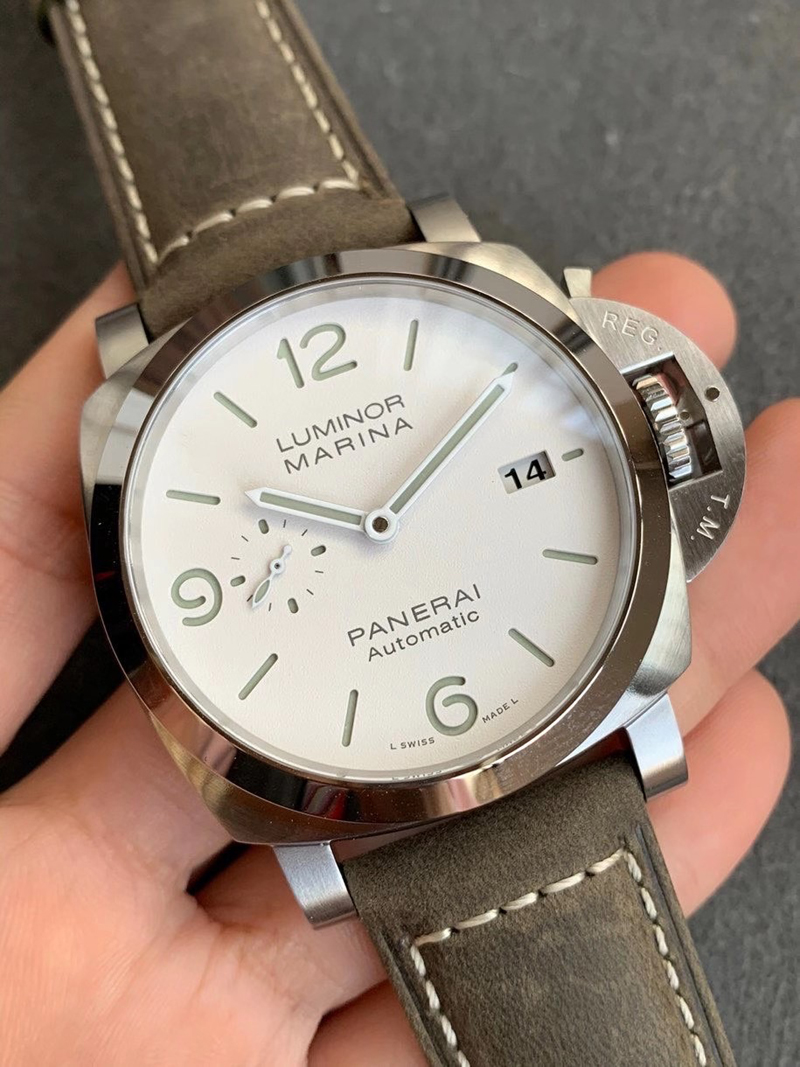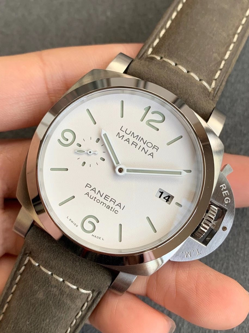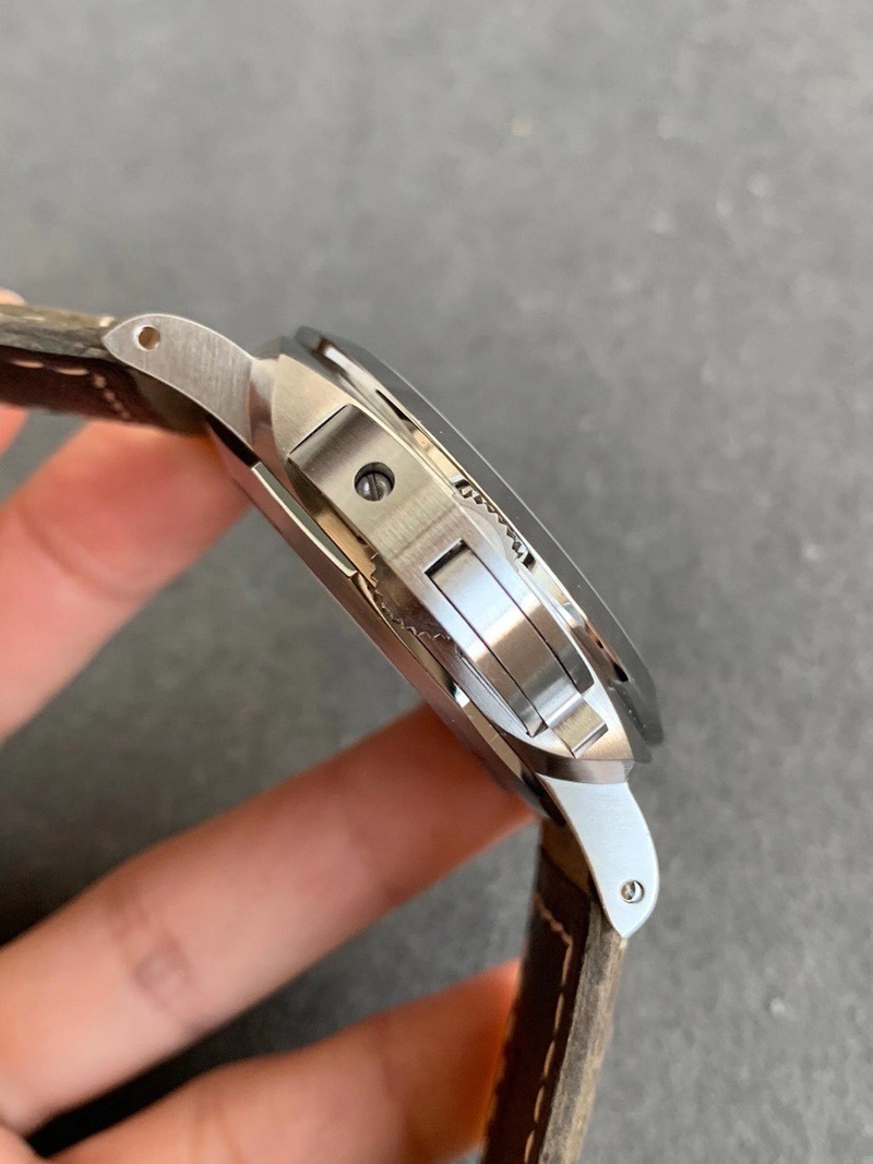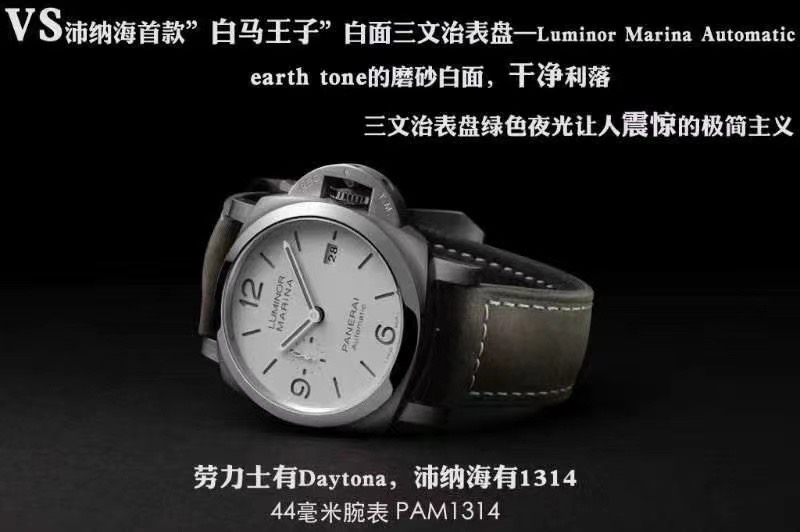 1:VS厂沛纳海PAM1314复刻版承袭了正品的经典设计,表壳采用了316L精钢材质,整体经过精细的打磨和拉丝工艺处理,质感上同步正品一致,增加了其耐磨性和耐腐蚀性。表壳直径为44mm,厚度适中,佩戴舒适,表壳的右侧还原正品一致“护桥”设计,VS厂在护桥上整体做工非常精湛,包括字体上的做工细腻,当然护桥的设计完全有效了作用,保护内部把头无法受到严重损伤。2:此外,VS厂在沛纳海1314的表镜采用最高品质的蓝宝石水晶玻璃材质,具备正品一致镀蓝膜和防眩晕工艺,细节做工一致同步,硬度达到了九级莫氏度,具有极佳的透光性与抗冲击性。VS厂沛纳海1314的三文治表盘绿色夜光让人震惊的极简主义,磨砂白色的表盘设计VS厂根据正品一致还原,其不存在有色差现象。